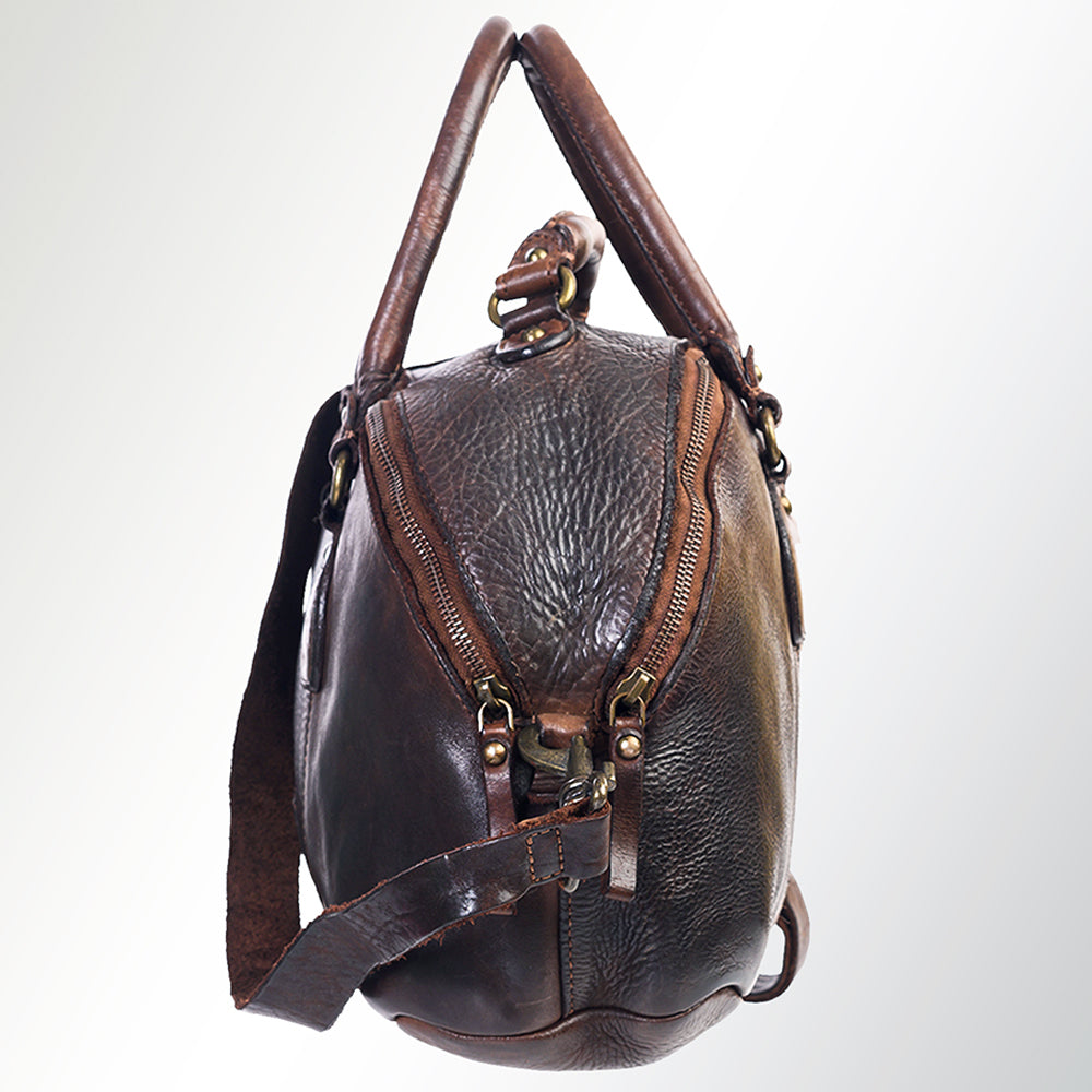 The Spaghetti Western creations undergo a meticulous hand-dyeing process utilizing an individualized method. Each creation is meticulously guided through multiple stages, featuring a proprietary approach involving hand dyeing, buffing, brushing, and finishing. This process demands significant time and attention to detail. Nonetheless, the outcome is a captivating blend of vintage and patina aesthetics, ensuring that each creation possesses its own unique and exclusive appearance.